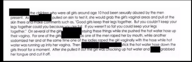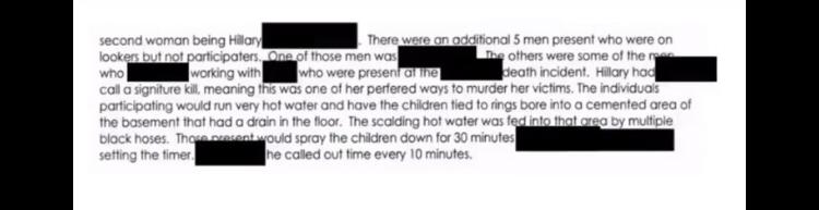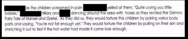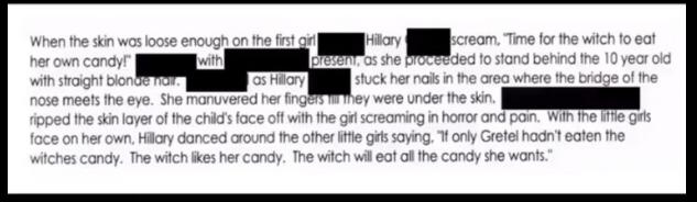 There were a number of videos seen, in one of them a young person is seen tied to a tree and in the other someone is tied to a bed. In the video with the one tied to the bed Hilary Clinton, Huma Abedin and others are seen with what I assume is a doctor and a young person. they are seen performing rituals with the child in the center of a pentagram, after performing the ritual they are apparently torturing the girl. Then who we assume is a doctor is seen surgically removing the face of the girl and Hilary is seen wearing the face and dancing around her laughing and giggling. keep in mind the girl is kept alive with intention to terrify her and I'm guessing the reasoning for this is to flood her blood with Adrenochrome. they are all seen dancing around her and laughing, covering themselves in blood. The girl is then screaming why are you doing this to me? and begging for them to kill her. They are then seen making faces at her in efforts to terrify her more, then they make a Z across her stomach, pull out her intestines and wearing it across their necks. when she was sufficiently terrified they use some kind of rod with a hook at the end, jamming it into her nose in efforts to remove her pineal gland, they knew how to do this without killing her. They pulled her pineal out through her nose and Hilary is seen eating it and offering it to Huma, they all took turns sharing. As the blood is gushing out her nose they are sucking on her nose and drinking the blood then they take a knife and cut part of her neck so she bleeds out. The girl dies as they capture her blood. In the other video a girl is seen tied to a tree and tortured .