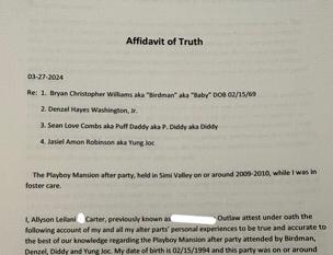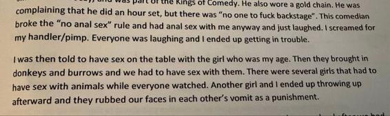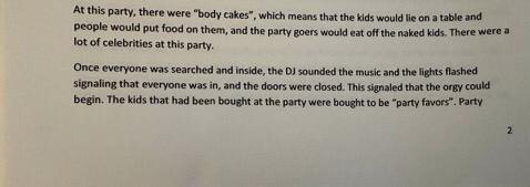 Ok so this part gets really dark so I’m just going to quote some of the things she alleged. “DIDDY parties, those are assault parties and I was one of the kids that was one of the party favors and a party favors means that you're set on top of the table and you're used as a toy for anybody who comes across the table or who wants to party at a certain time of night. When the music stops and then the DJ starts these lights and they close the doors and then everybody turns into like a frenzy and starts going into a crazed animal like demonic state and you have no idea what's going on. I was thought that you know you're in the presence of Royalty and they make it seem like you're in the presence of Hollywood so you should be honored and you should be appreciating that you're there and I was that person I totally acted like that. I had a pimp and he had rules, he had a lot of rules for things like full house. So full house is basically just a full blown house sex party. In the full house there are a few celebrities over there, it's not just celebrities there's a lot of different people there’s CEO’S, Music executive, comedians, all sorts of people. They call it an all-black party but it was mainly because a lot of the party favors were black kids, I was in the care of Riverside County Child Protective Services at the time I was 15 barely 16, it's foggy a lot happened that night and I went really numb and if there's videos or if there's anything that could go from that then pull up because we all know that there's so many cameras around. Nobody's really asking about the kids that are present in these parties now and we're thinking because they're really just going after all the celebrities and the adults which I'm happy that we're finally here and I'm grateful that we're finally pulling the names that need to be pulled in the big fishes that need to be pulled but at the same time nobody's asking about the kids.