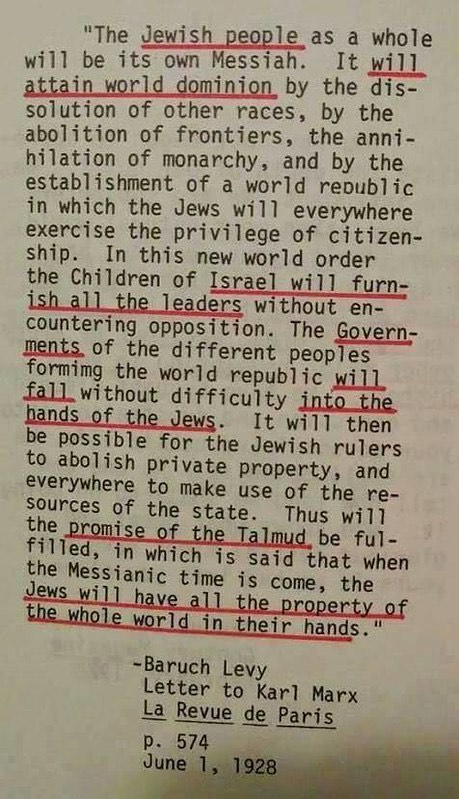 A letter from Baruch Levy to Karl Marx, the letter was reprinted in La Revue de Paris on page 574, dated June 1st 1928. The letter reads as follows ["The Jewish people as a whole will be its own Messiah it will attain world dominion by the dissolution of other races, by the abolition of frontiers the annihilation of monarchy and by the establishment of a world republic in which the Jews will everywhere exercise the privilege of citizenship. In this new world order the children of Israel will furnish all the leaders without encountering opposition, the governments of the different peoples forming the World Republic will fall without difficulty into the hands of the Jews, it will then be possible for the Jewish rulers to abolish private property and everywhere to make use of the resources of the state thus will the promise of the Talmud be fulfilled in which is said that when the messianic time is come the Jews will have all the property of the whole world in their hands."] The letter ends, this letter predicted precisely what we're seeing today Levy uses the now familiar sinister term "New World order", he refers to open borders, race mixing, Jewish supremacy with the goal of a Jewish world government where non-Jews will own nothing. today this is the mantra of the Jewish controlled World Economic Forum.
