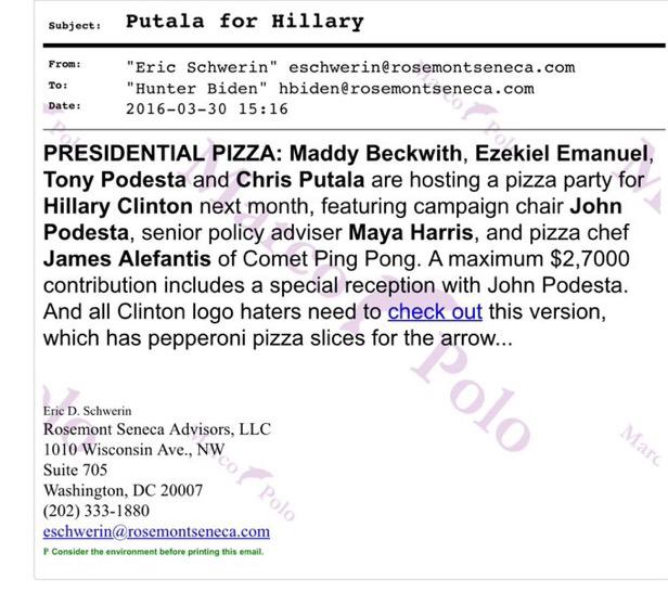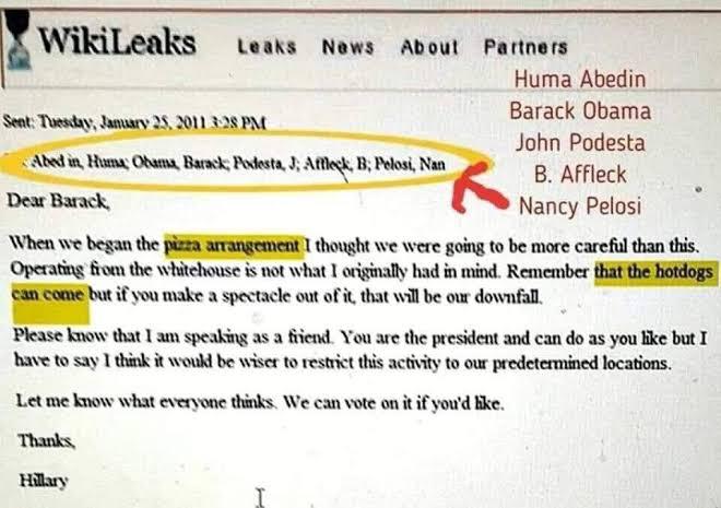 There where leaked emails between John Podesta, Marina Abramovic, Hilary Clinton and ex president Obama and in these emails they kept taking about pizza and pizza parties keep in mind these emails are real and were addressed as innocent private discourse. Now where did the pedophilia allegations come from, there was a pedophile ring related to a pizzeria called Comet Ping Pong. Their websites got hacked and they had listings of pizza for $65,000 and other crazy prices and these where apparently a cover for human trafficking. It was discovered by 2007 official FBI documents that pedophiles have code words and symbols among themselves which they use to recognize their preferences e.g hotdog, pizza, etc.