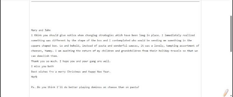 I think you should give notice when changing strategies which have been long in place. I immediately realized something was different by the shape of the box and I contemplated who would be sending me something in the square shaped box. Lo and behold, instead of pasta and wonderful sauces, it was a lovely, tempting assortment of cheeses, Yummy. I am awaiting the return of my children and grandchildren from their holiday travels so that we can demolish them. Thank you so much. I hope you and your gang are well.