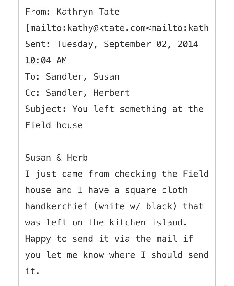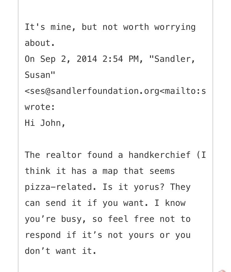 Susan emails John and asks if the handkerchief is his. She doesn't seem sure about that, but she does seem pretty sure that it's got a "pizza-related map" on it.